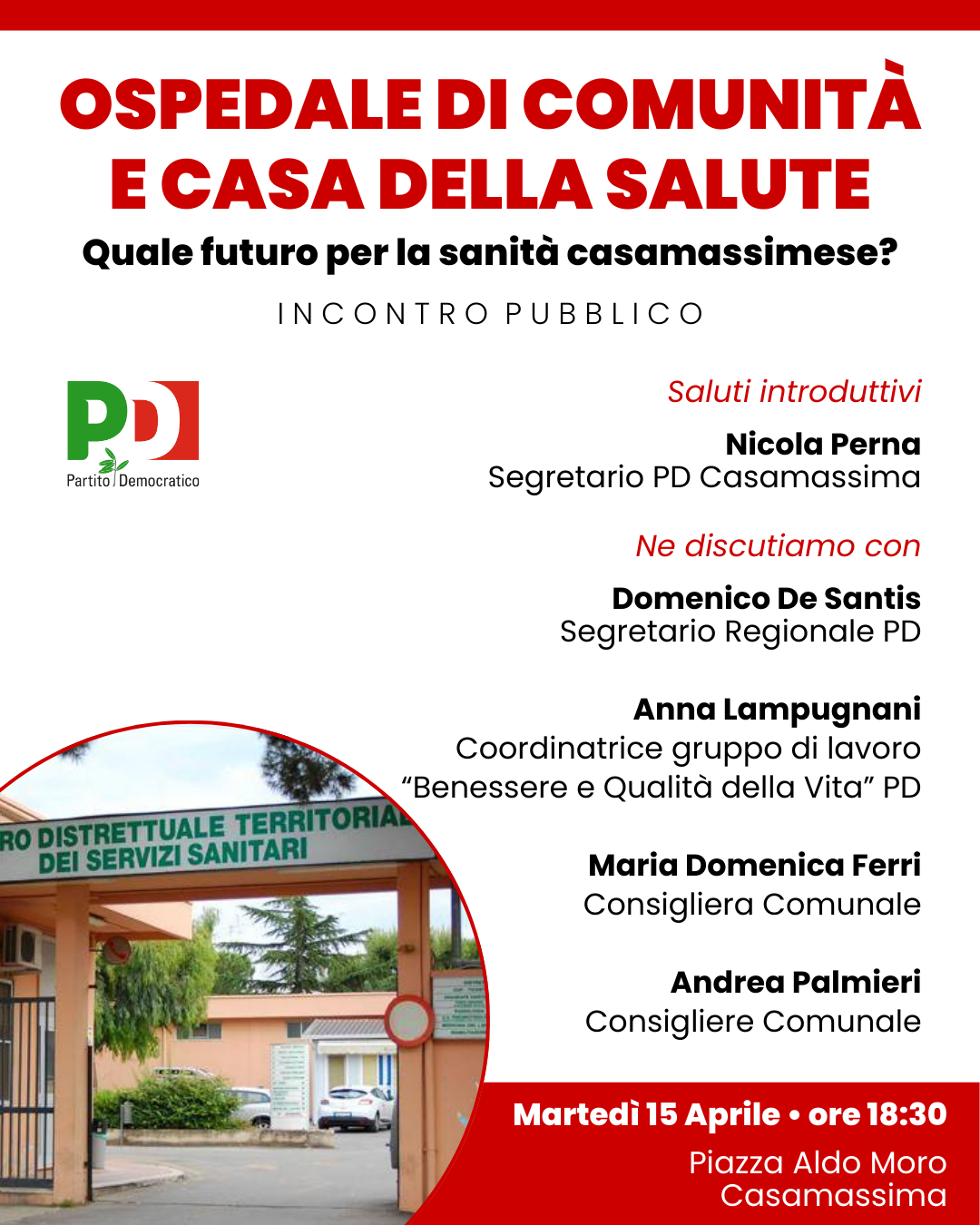 Martedì 15 aprile, alle ore 18:30 in Piazza Aldo Moro a Casamassima, il Partito Democratico organizza un incontro pubblico dal titolo “Ospedale di Comunità e Casa della Salute – Quale futuro per la sanità casamassimese?”. Un’occasione di confronto aperto alla cittadinanza per discutere del futuro dell’assistenza sanitaria territoriale, alla luce delle nuove sfide e delle opportunità offerte dalla riorganizzazione dei servizi sanitari locali.